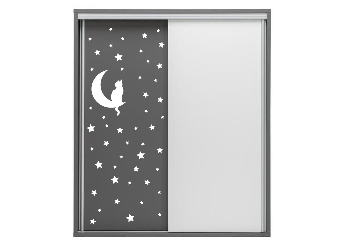 Kupując jedną sztukę otrzymujesz komplet 93 sztuk jednokolorowych naklejek w wybranym kolorze folii. W zestawie znajduje się 1 szt. kota na księżycu o rozmiarze 28x40 cm oraz 92 szt. gwiazdek wielkości 7cm, 5 cm i 3 cm.
