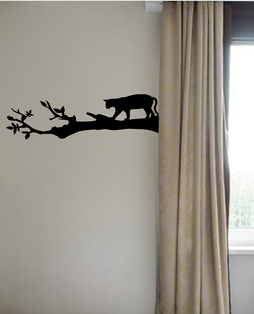 Kupując jedną sztukę otrzymasz zestaw widoczny na zdjęciu w wybranym kolorze folii. W zestawie znajduje się 1 szt. kota kroczącego po konarze drzewa. Rozmiar całej naklejki 28x95 cm.