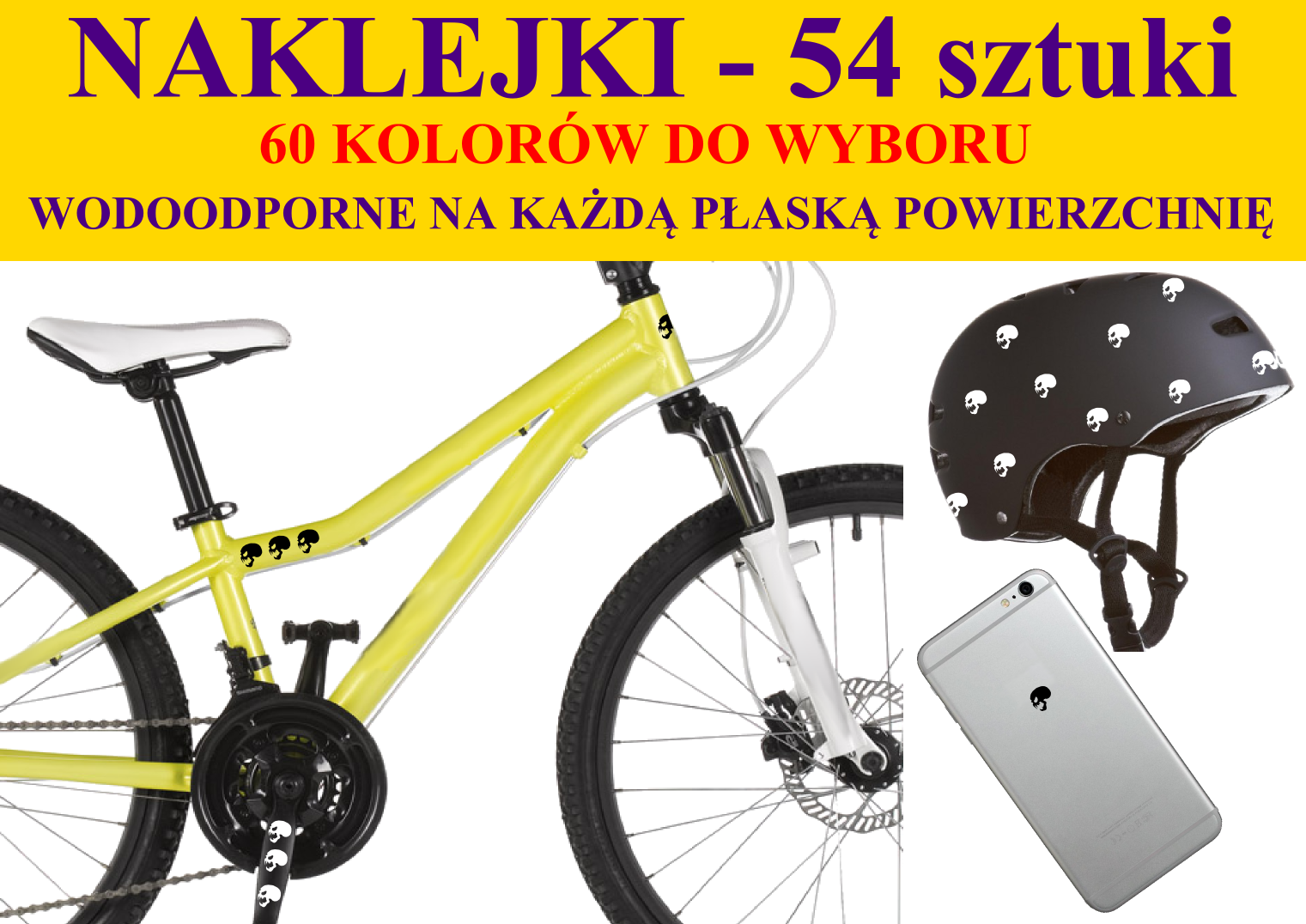 NAKLEJKI NA ROWER, KASK - CZASZKI 54 szt 60 kolorów