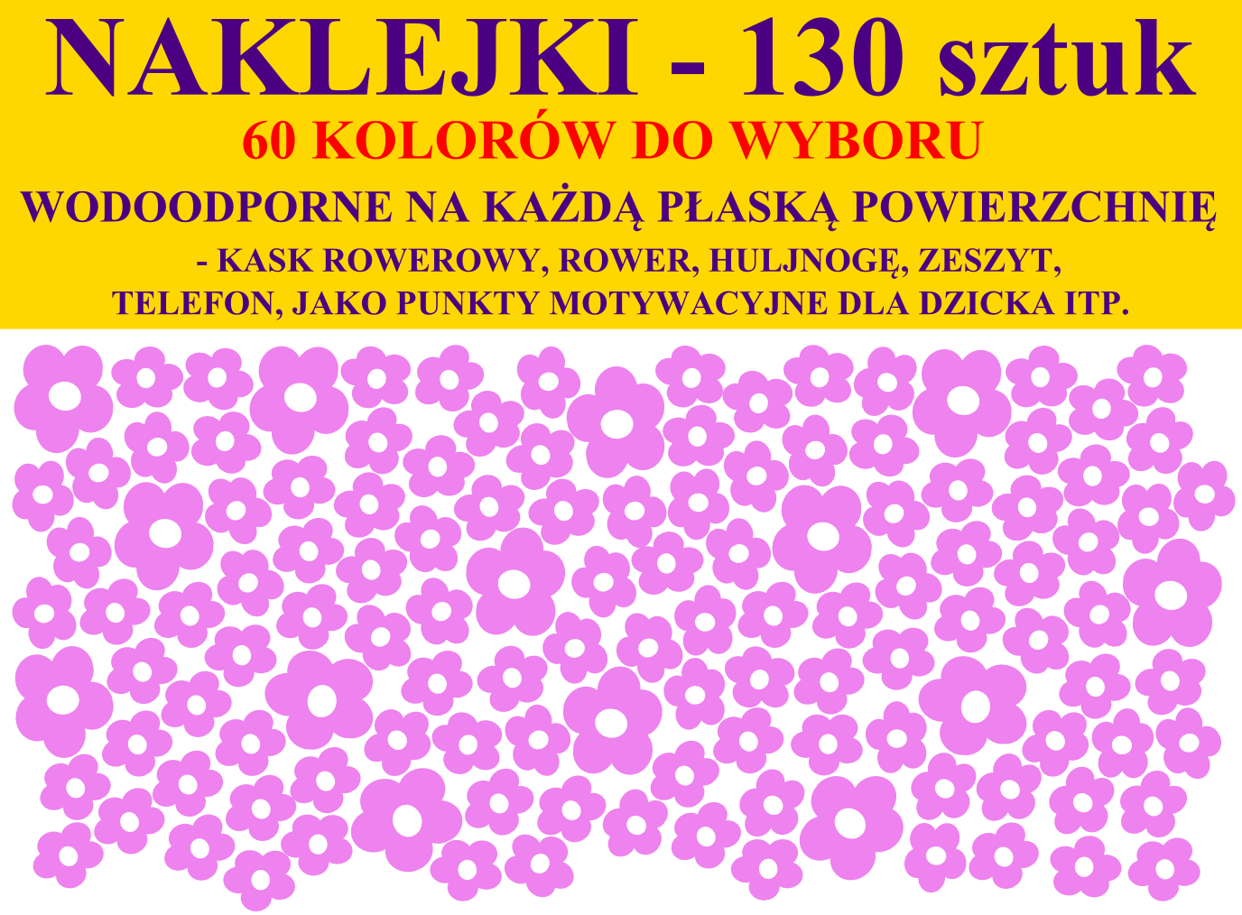 Zestaw 130 sztuk jednokolorowych naklejek na rower, kask, telefon komórkowy itp. Do wyboru 60 kolorów.