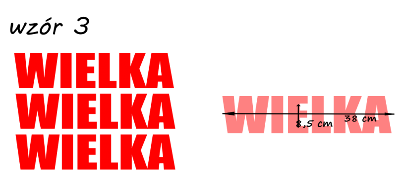 Kupując jedną sztukę otrzymujesz zestaw naklejek widoczny na zdjęciu. W skład zestawu wchodzą 3 sztuki napisów WIELKA, każdy wielkości 38x8,5 cm.